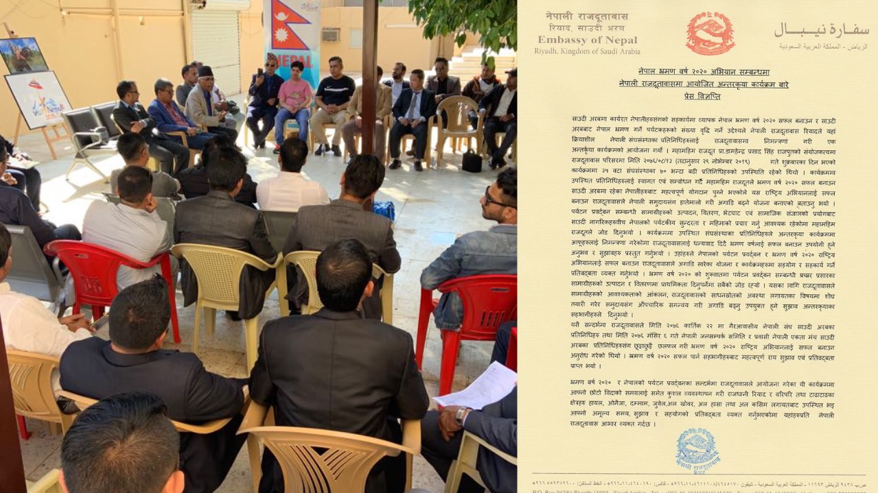 साउदी अरबमा कार्यरत नेपालीहरुसंगको सहकार्यमा व्यापक नेपाल भ्रमण वर्ष २०२० सफल बनाउन र साउदी अरबबाट नेपाल भ्रमण गर्ने पर्यटकहरूको संख्या वृद्धि गर्ने उद्देश्यले नेपाली राजदूतावास रियादले यहां क्रियाशील नेपाली संघसंस्थाका प्रतिनिधिहरुलाई राजदूतावासमा निमन्त्रणा गरी एक अन्तर्कृया कार्यक्रमको आयोजना गर्यो । महामहिम राजदूत प्रा.डामहेन्द्र प्रसाद सिंह राजपुतको संयोजकत्वमा राजदूतावास परिसरमा मिति २०७६/०८/१३ (तदानुसार २९ नोभेम्बर २०१९) गते शुक्रबारका दिन भएको कार्यक्रममा ३५ वटा संघसंस्थाका ७० भन्दा बढी प्रतिनिधिहरुको उपस्थिति रहेको थियो । कार्यक्रममा उपस्थित प्रतिनिधिहरुलाई स्वागत एवं सम्वोधन गर्दै महामहिम राजदूतले भ्रमण वर्ष २०२० सफल बनाउन साउदी अरबमा रहेका नेपालीहरुबाट महत्वपूर्ण योगदान पुग्ने भएकोले यस राष्ट्रिय अभियानलाई सफल बनाउन राजदूतावासले नेपाली समुदायसंग हातेमालो गरी अगाडि बढ्ने योजना बनाएको बताउनु भयो ।